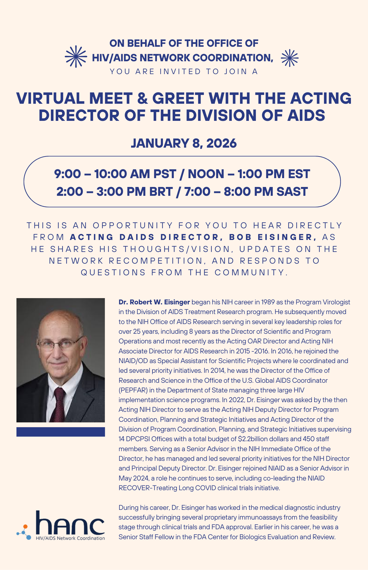 As of December 2025, Drs. Raphael Landovitz and Sinead Delany-Moretlwe will serve as co-principal investigators for the HIV Prevention Trials Network. Drs. Myron Cohen and Wafaa El-Sadr, who led as co-principal investigators since 2013, leave behind a legacy of leadership, scientific excellence, and commitment to community partnership. Their guidance has been instrumental in shaping the Network’s global impact, and they will continue to serve on the HPTN Executive Committee in advisory roles.